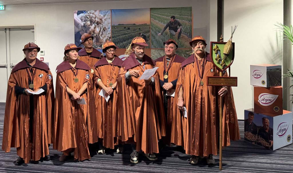 Lors du salon SIVAL d’Angers le mardi 13 janvier dernier de 18h à 19h salle Ardésia, Parc des Expositions d’Angers, ont été fêté les 10 abs de l’IGP échalote d’Anjou Devant une trentaine d’invités choisis et avant de goûter des spécialités délicieuses à l’échalote fabriquées par le Chef étoilé Pascal Favre d’Anne (dont de la gouline angevine) et après introduction par le Grand Maitre Guillaume Thomas, il a été rappelé comment était née cette IGP échalote d’Anjou, son histoire et sa gloire actuelle qui en fait l’échalote la plus recherchée aujourd’hui par le négoce et les consommateurs.